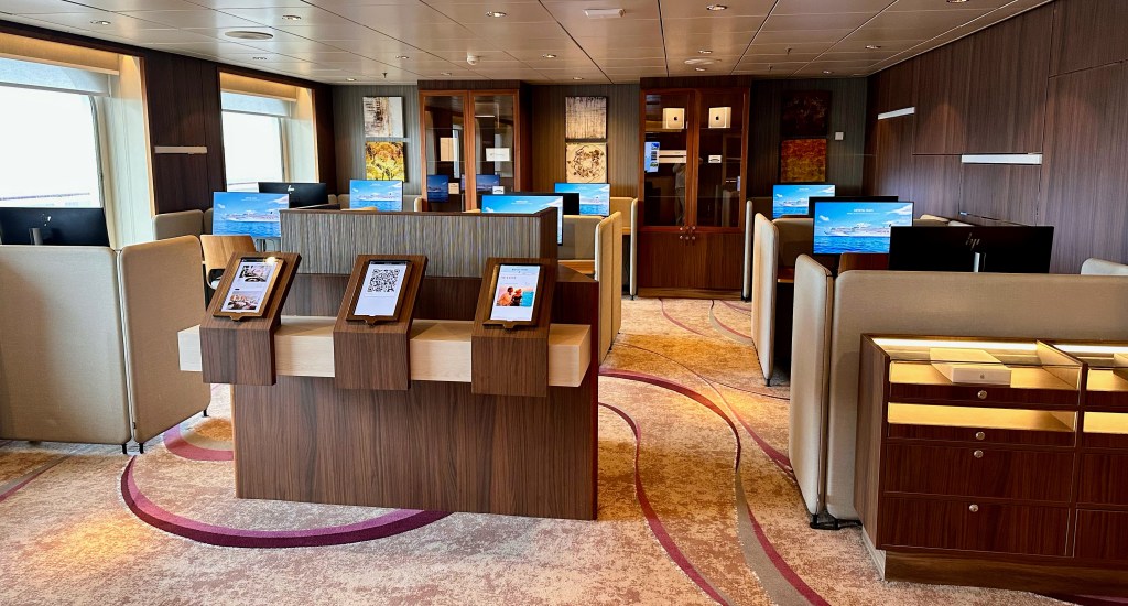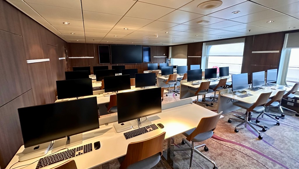 Another feature that sets this ship apart from its peers (or is it piers?) is the computer facility. Serenity’s computer network is second to no other. There are two sections that fill this 800+ sq. ft. section of the ship. One section equipped with eight MS Windows workstations, a printer/scanner and a lab of twenty-three Apple iMacs, a teaching lectern for daily computer classes–– everything from from how to use your iPhone to AI for photographers. There are three IT professionals and a guest instructor (Tanya) aboard.