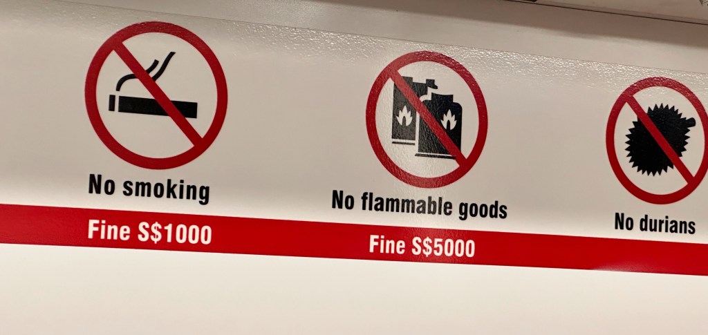 You really can’t get lost if you tried and the MTR is the way to travel in Singapore. The underground is cool, clean and the fares seem to be $2.95/person/ride. Just do not eat, smoke, drink, carry flammable goods or Durian Fruit into the MTR.