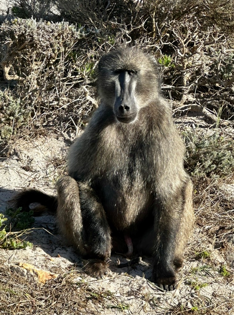 We saw a lone baboon down along the coast and our guide said that there is a troop that feeds on shellfish and that might contribute to how they seem to be smarter than other inland troops. They have figured out how to open car doors. There are signs reminding humans to lock their cars.