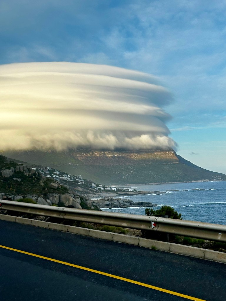 Farther along the coast we could see the town of Macaroon––– only kidding. But the cloud formation above the peak is so macaroon looking it does not look real. I have come across images of this on the web, but never in person. Wow!