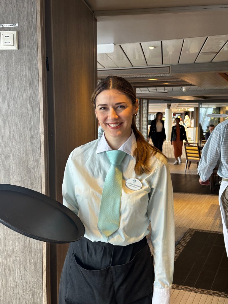 Anastasia, who is always there and never seen. I swear she just appears when you are thinking about a cocktail, but are either too lazy to get up or not sure you really want one.. and she appears. You could be in the Saloon, where you will find her at nights until the last passenger is swept out , or in the morning at breakfast craving a Mimosa, as we did this morning, or at Trivia at noon for a ginger ale or at the Cove around cocktail hour.